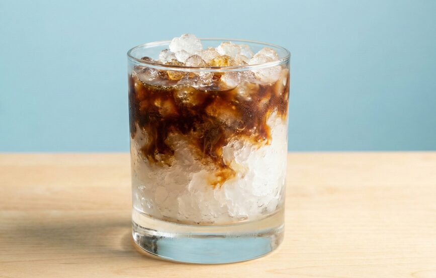 El éxito del Morena Ardiente reside en el hielo frappé. Al ser trozos pequeños, diluyen el cóctel un poco más rápido que un cubo de hielo normal. Esto es intencional: la dilución suaviza la potencia de las 2 onzas de vodka y abre los aromas del café, haciendo que un trago muy fuerte se sienta suave y cremoso en el paladar.